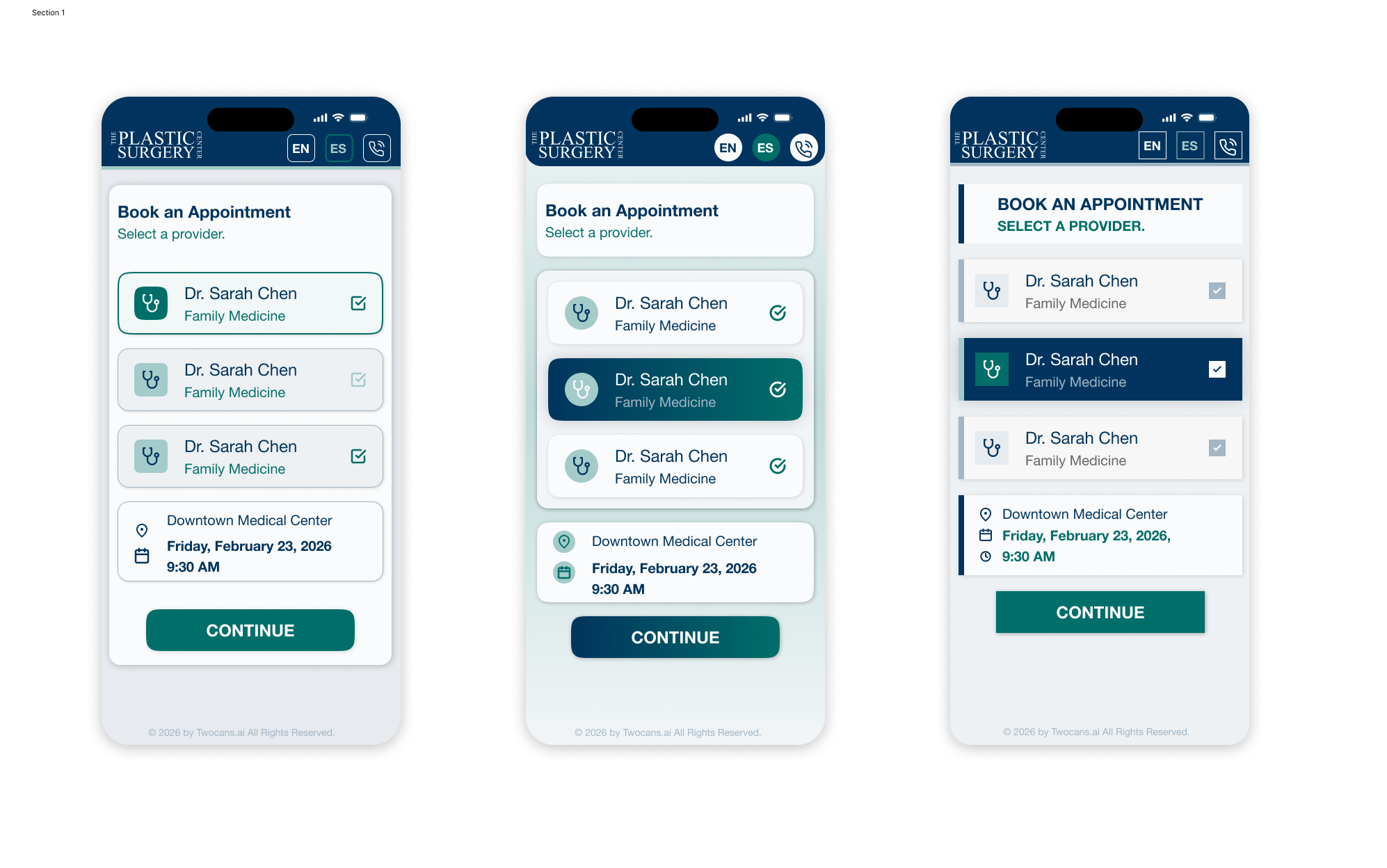 Across all versions, consistent color psychology (navy for professionalism, teal for care), strong visual confirmation (icon + background shift), and a fixed, high-visibility “Continue” CTA guide users forward. Language toggles and clearly chunked information blocks further reduce friction and support accessibility.